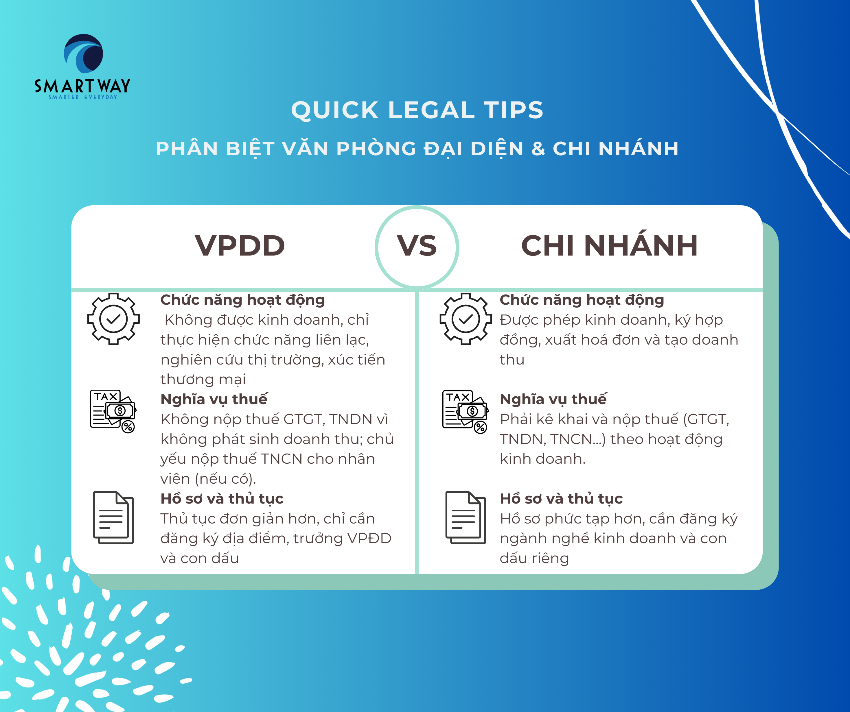 Khi mở rộng quy mô hoạt động, doanh nghiệp thường đứng trước lựa chọn: nên thành lập Văn phòng đại diện hay Chi nhánh?Dù cả hai đều là đơn vị phụ thuộc của doanh nghiệp, nhưng chức năng, quyền hạn và nghĩa vụ pháp lý lại có nhiều điểm khác nhau. Smartway tổng hợp những […]